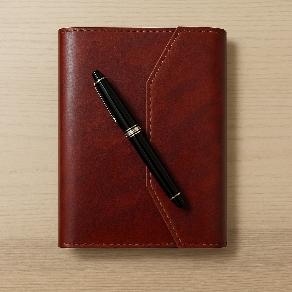 “A black fountain pen rests diagonally across a closed red leather notebook on a light wood surface.”